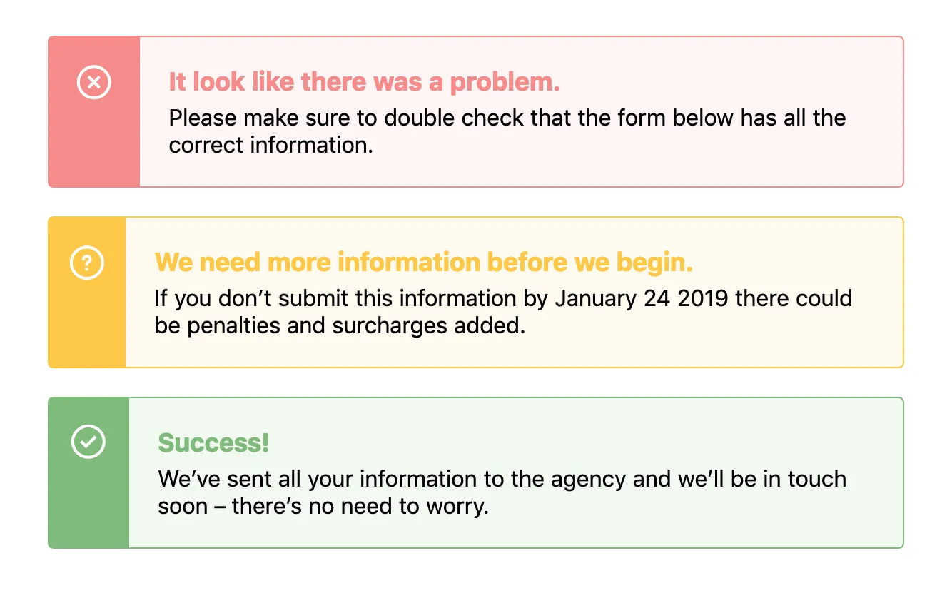 Por exemplo, em um alerta, podemos precisar de um estilo de aviso, um estilo de erro e um estilo de sucesso — cada um deles pode ser um pouco diferente, desse jeito: